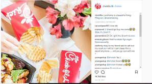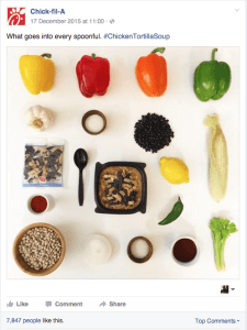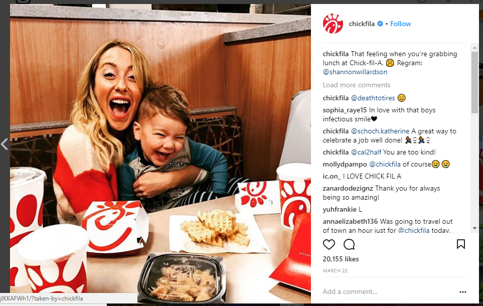 under two or three minutes in most cases (Pathak, 2016).” According to Shareen Pathak, Chick-fil-A had only seen an increase of 10 percent of the production of content, but one can contest that the quality of this content has probably gotten a lot better not to mention how quickly they respond to their consumers on social media (2016). Another thing to pay attention to is that Chick-Fil-A takes a different approach on each social media platform, in order to cater to their different target audiences—being that different consumers frequent different platforms. For instance, on Facebook, most of their audience are moms, so they focus their content on recipes. On Instagram, they are trying to reach out to their younger crowd, and generally post enticing pictures of food, but they strive to add a human element. The photos are taken on iPhones and they don’t do any retouching to give it that authentic vibe.