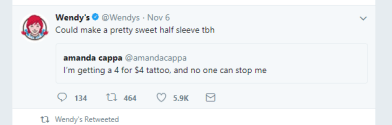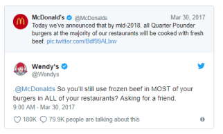 Now, Chick-Fil-A has a more traditional strategy for utilizing social media, more wholesome and appeals to families. Wendy’s utilizes social media in a completely different way, their style is a little more rough around the edges. It’s almost as if one college interns got their hands on the Twitter account and struck gold. Wendy’s like to create content that still makes them seem human and relatable, but they have a social media presence that is funny, and probably more relatable for millennials and the younger generations. In 2017, Wendy’s had a phenomenal year for their Twitter account, first, it started with hilarious disses, which included disses at competitor McDonald’s (Check out a list of these epic disses, now). Not too long after this, they made Twitter history with #NuggsForCarter, where high school aged Twitter user Carter Wilkerson tweeted at the company, “How many retweets for a year of free nuggs?” Wendy’s replied 18 million. This set a new record for the most retweeted post, surpassing the infamous Ellen DeGeneres Oscar’s selfie (Ward, 2017)